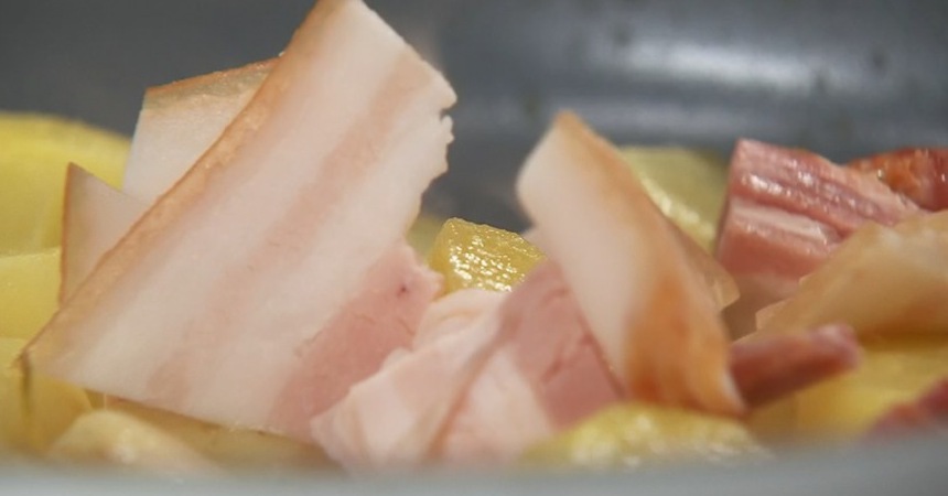 Раздавливаем зубчик чеснока и добавляем его в сковороду вместе с порезанным кусочками беконом. обжариваем пару минут.