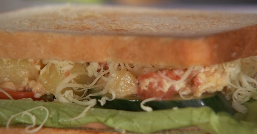 Смазываем тост соусом. Сверху укладываем лист салат, затем томаты и огурцы. Выкладываем ложкой омлет. Посыпаем сыром. Придавливаем тостом сверху.