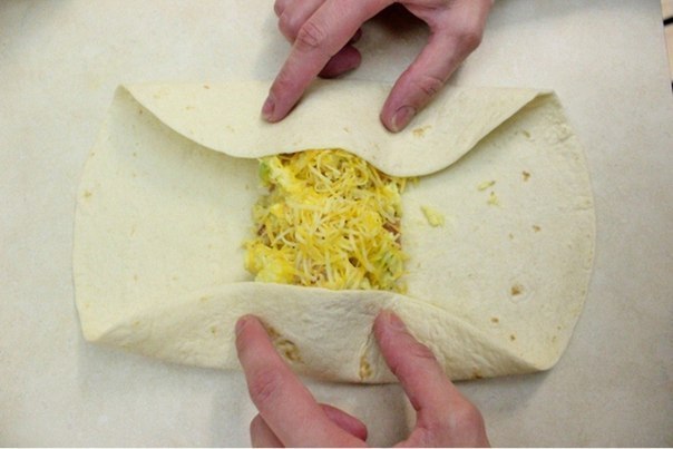 Сворачиваем готовое бурито. Можно есть сразу, либо хранить в холодильнике, обернув в фольгу или в пергамент.