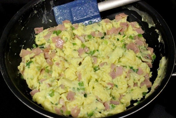 Порежем перец и обжариваем пару минут. Добавляем порезанную ветчину и еще обжариваем пару минут. Выливаем яйца в сковороду, можно добавить зелень (петрушка, кинза, укроп) и жарим до готовности