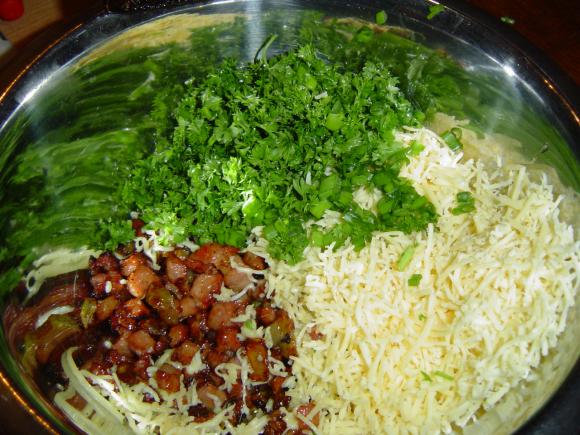Лук и ветчину нарезать кубиками и обжарить на сливочном масле. Петрушку и зеленый лук нарубить. Сыр натереть