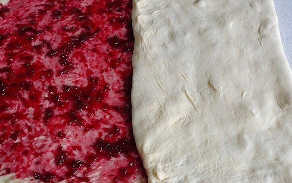 Дрожжи необходимо растворить в половине стакана тёплого молока, добавить половину муку и убрать в тёплое место на пол часа. После в тесто добавить оставшуюся муку, яйца, соль, сахар и размягченное сливочное масло. Перемешать до однородной массы и убрать на 2 часа в холодильник. Клюкву перемалываем в блендере, добавляем сахар, цедру. Переливаем в сотеёник и варим на медленном огне до загустения. Из теста делаем прямоугольник и смазываем его начинкой.