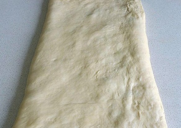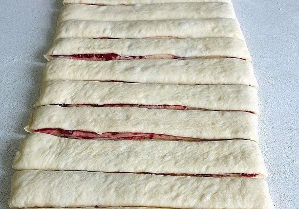 Края теста защипываем и немного прокатываемся по тесту скалкой. Разрезаем тесто на полоски шириной 3-4 см.