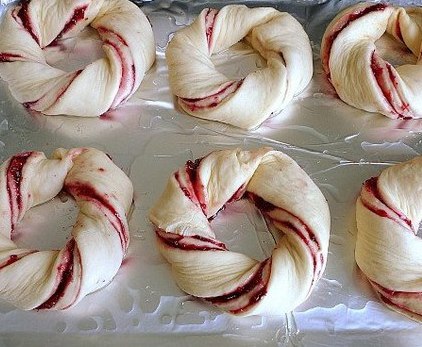 Перекручиваем каждую полоску 4-5 раз и соединяем концы в виде кольца. Противень смазываем маслом и выкладываем на него венчики и отправляем в разогретую до 220 °C духовку на 15 минут.