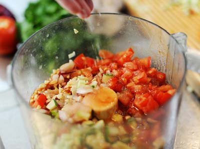 Режем все овощи мелкими кубиками. Половину кабачков, помидоров, лука, огурца, томатного сока добавляем в блендер для измельчения. Также в блендер кидаем оливковое масло, чеснок, уксус, сахар.