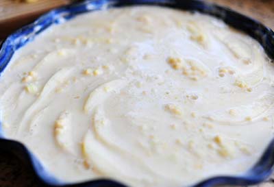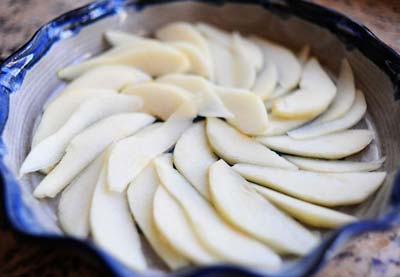 Очищаем грушу от кожуры, разрезаем пополам и убираем зёрна. Режем тонкими дольками грушу и укладываем по кругу в форму для запекания. Посыпаем сверху ложку сахара и тёртый имбирь