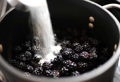 Добавляем в кастрюлю ежевику, четверть стакана сахара и сок выжитого лимона. Варим на слабом огне примерно 20 минут. Получившуюся смесь процеживаем через тонкое сито для удаления косточек.
