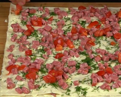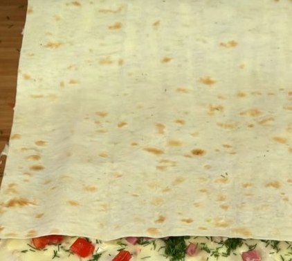 Колбасы и помидоры нарезаем кубиками. Выкладываем лаваш, посыпаем его укропом с колбасой и помидорами. Накрываем лавашом и повторяем процедуру.