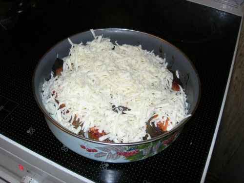 Достаем из духовки блюдо и хорошенько посыпаем сыром. Закидываем обратно еще минут на 5, до тех пор пока сыр не расплавится и не станет покрываться корочкой