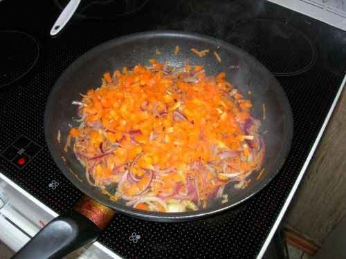 Морковь натираем на крупной терке. Лук нарезаем полукольцами, лучше взять красный лук. Болгарский перец также режем мелкими кубиками. Лук и морковь кидаем в сковороду вместе с солью и специями, и поджариваем пару минут. Потом добавляем перец и жарим еще пару минут