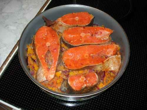 Берем подходящее блюдо для запекания. На дно кладём под жарку, сверху выкладываем рыбу. И ставим это дело в духовку на 20-25 мин при 230 °C.