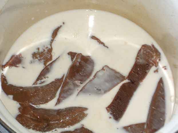 Говяжью печень отчищаем от пленки и нарезаем ломтиками. Погружаем нарезанную печёнку в молоко на полчаса. Молоко придаст нежности