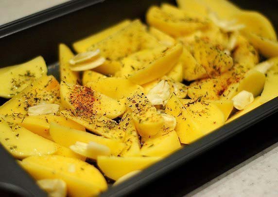 Режем дольками картофель и укладываем в форму для запекания. Добавляем оливковое или растительное масло и немного специй. Выдавливаем пару зубчиков чеснока на картофель.