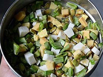 Очищаем ямс, картофель, тыкву, режем кубиками и ложим кастрюлю. Добавляем соль, куркуму, колоказию съедобную, режем бобы и тушим это на медленном огне, пока овощи не станут мягкими.