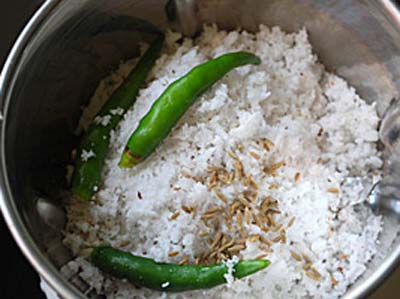 Добавляем в отдельную кастрюлю кокосовую стружку и масло, рисовую муку, режем зеленый перец чили, добавляем немного воды и доводим до кипения