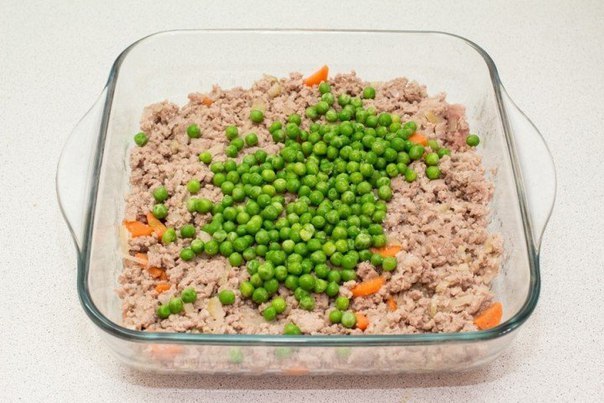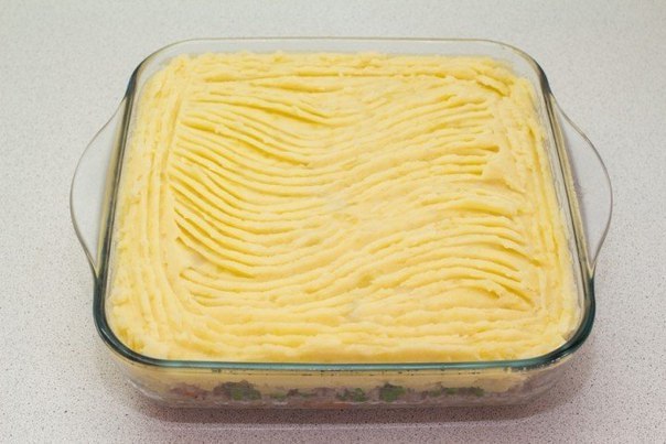 Поверх фарш выкладываем картофельное пюре и разравниваем. Отправляем блюдо в разогретую до 180 °C духовку на полчаса
