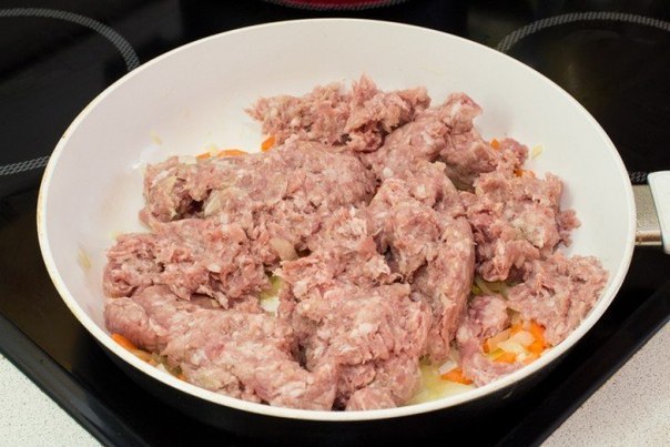 Очищаем мелко лук, чеснок, морковь, обжариваем все на оливковом масле пару минут. Добавляем фарш, специи и тушим 5 минут