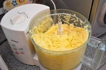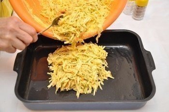 Мелко режем лук и натираем морковь. Слегка обжариваем на сковороде и добавляем к картофелю. Также в миску добавляем яйца, манную крупу, соль, перец, горчицу, майонез, мелко порезанный чеснок и специи по вкусу. Всё это тщательно перемешиваем