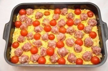 Полученную картофельную массу выкладываем в смазанную маслом форму. Равномерно распределяем по всей поверхности, затем слегка углубляя сверху кладем фрикадельки и помидоры черри.