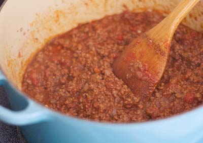 Начнём с мясного соуса. Топлённое и оливковое масло добавляем в большую кастрюлю, затем добавляем туда порезанный лук (можно добавить пару зубчиков чеснока) и обжариваем пару минут. Затем кладём говяжий фарш, томатную пасту и нарезанные помидоры, петрушку, орегано, соль, перец, корицу и мускатный орех, а также вино. Если есть куринный бульон, то можно добавить стакан бульона. Всё это варим на медленном огне примерно 15 минут, пока жидкость не испарится.