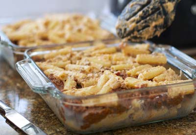 В кастрюле нагреваем сливочное и оливковое масло, затем добавляем макароны, сыр, немного мускатного ореха, взбитые яйца. Всё это перемешиваем.