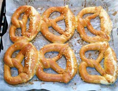Полученные брецели макаем в раствор гидроксида натрия. Это предаст им коричневатый оттенок. Противень с кренделями посыпаем крупной солью и ставим в разогретую до 200 °C духовку на 20-25 минут.