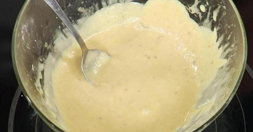 Для приготовления соуса взбиваем в блендере 2 яйца. Добавляем немного сахара, соли, оливкового масла. Добавляем немного тёртого сыра пармезан, зубчик чеснока, сок лимона, анчоусы. Взбиваем все до однородной массы.