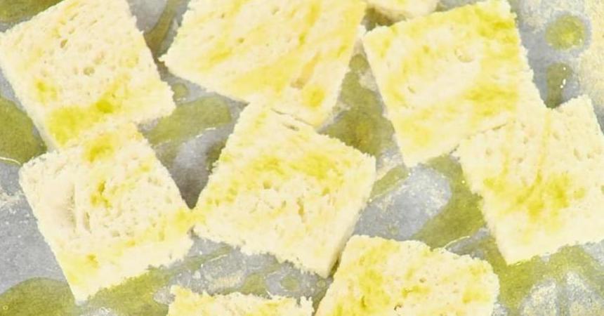 Хлеб для тостов режем крупными кубиками. и выкладываем их на противень, предварительно застеленный пергаментной бумагой. Слегка посыпаем их солью и оливковым маслом. Отправляем противень в разогретую духовку на 5-7 минут.