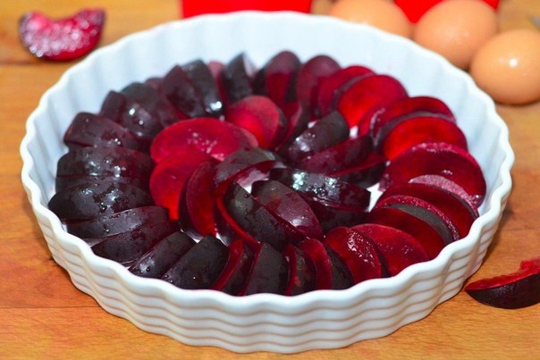 Вымоем сливы и удалим косточки. Порежем сливы дольками и уложим дольки в форму для выпекания по спирали.