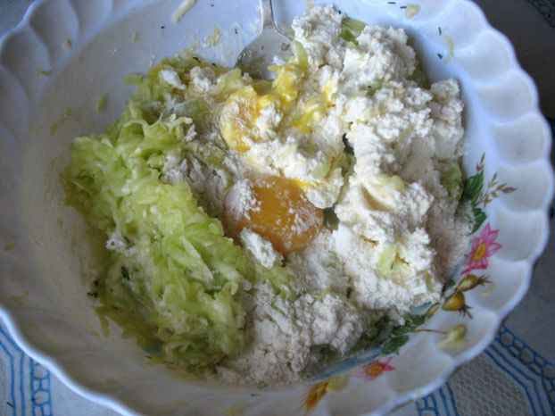 Отжимаем сок с кабачков и перекладываем в глубокую миску. Добавляем яйца, муку, творог, зелень и перемешиваем