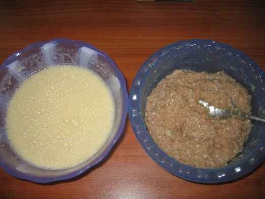Куриное филе перекручиваем, добавляем мелко нарубленный лук, 1 яйцо, соль и перец и тщательно перемешиваем. Для приготовления кляра надо взбить 4 яйца, молоко, и немного муки.