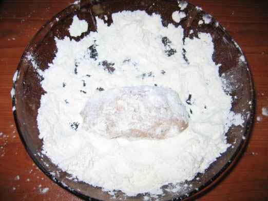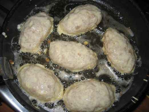Делаем из фарша лепешки, внутрь каждой кладем небольшой кусочек сливочного масла. Панируем котлеты в муке