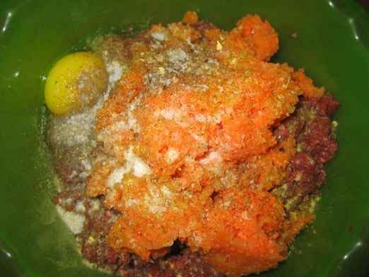 Морковку и луковицу измельчаем в блендере, добавляем их к фаршу. Также кидаем 1 яйцо, солим, перчим и перемешиваем