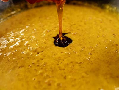 Обжариваем лук и пару зубчиков чеснока на медленном огне. Высыпаем 1 столовую ложку попрошка карри и продолжаем обжаривать еще пару минут. При отсутствии порошка его можно приготовить в домашних условиях. Для этого потребуется обжарить одну столовую ложку семян тмина и горчицы, 2 столовых ложки семян кориандра, столовую ложку укропа и чайную ложку черного перца. Обжарившуюся смесь смешиваем со столовой ложкой куркумы и имбиря. Можно добавить половину чайной ложки порошка чили. Вливаем кокосовое молоко, мёд. Помешиваем соус. Подождём пока соус закипит и выжимаем сок лимона.
