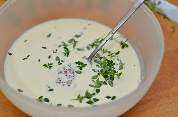 В сливки выдавливаем чеснок, добавляем немного горчицы и листики тимьяна, слегка солим и перчим, хорошо перемешиваем.