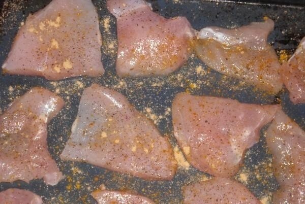 Филе курице режем на тонкие пласты, солим перчим с обоих сторон и выкладываем на смазанный противень.