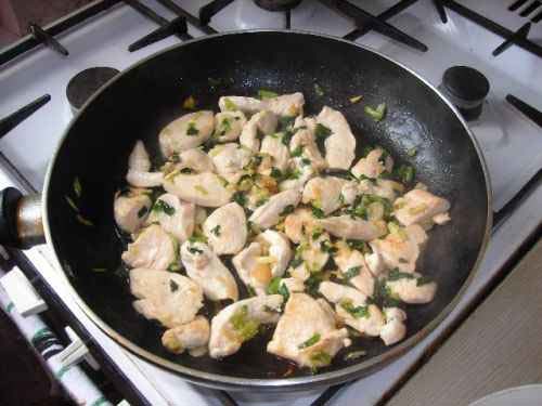 Режем немного свежего имбиря, пару зубчиков чеснока небольшими дольками. Режем пару перьев зеленого лука. Все это кидаем в разогретую сковородку, следом добавляем порезанную небольшими кусочками куриное филе. Обжариваем примерно 10 минут
