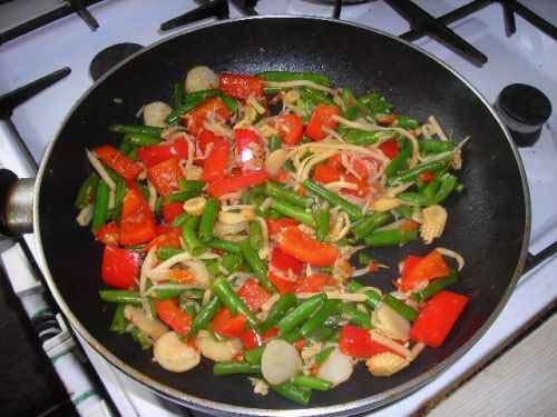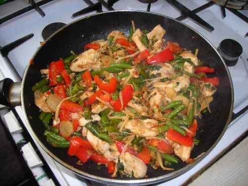 Убираем курицу и поджариваем стручковую фасоль или горох, сладкий перец. Все это заливаем куриным бульоном, либо просто добавить немного воды. Тушим овощи около 5 минут. Затем добавляем соль, перец, можно добавить соевый соус, немного паприки. Тушим еще пару минут