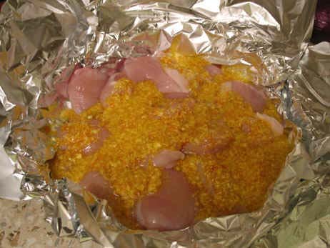 Куриное филе помыть, обсушить, натереть солью. Разложить фольгу на форму для запекания или противень, положить туда филе, обмазать полученной смесью и накрыть фольгой.
