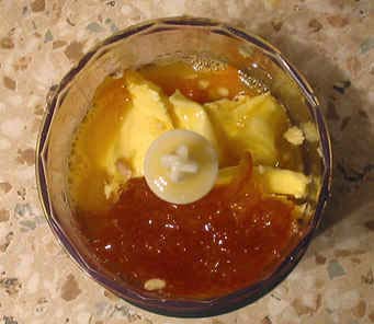 Очищаем 3-4 зубчика чеснока. С апельсина снимаем цедру, из мякоти выжать сок. Измельчить и смешать чеснок, цедру, джем и сливочное масло в блендере
