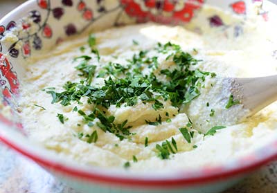 Перемешиваем итальянское молочный продукт Рикотта, яйца, сыры, базилик для приготовления начинки. Можно вместо базалика использовать петрушку