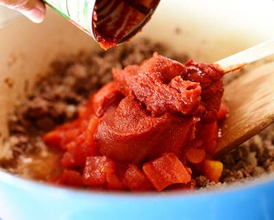 Для приготовления начинки необходимо в кастрюльке нагреть оливковое масло. Добавляем лук и можно еще чеснок, тушим пару минут. Затем добавляем говяжий фарш, и тушим пока не подрумянится. Сливаем излишки жира, режем и добавляем помидоры и томатную пасту. Тушим на медленном огне примерно полчаса.