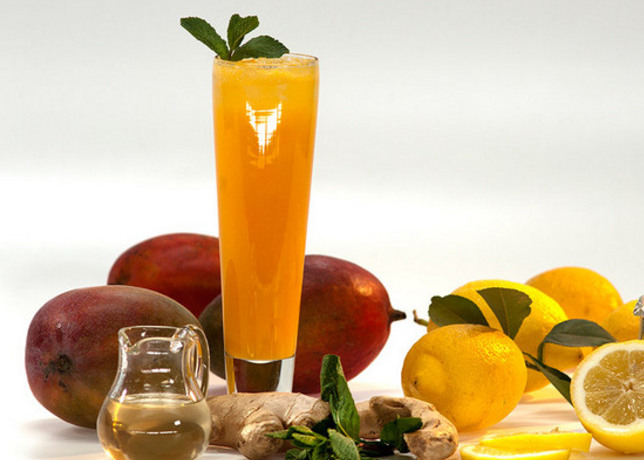 Выжимаем сок с лимонов, манго разрезаем на маленькие ломтики и раздавливаем. Мякоть манго отправляем в кувшин вместе с соком лимона, мятой, сахаром и тертым кусочком имбиря. Хорошенько перемешиваем и пробуем!