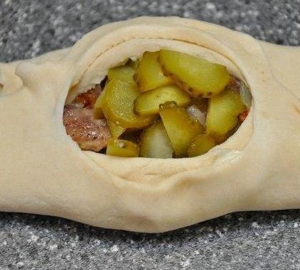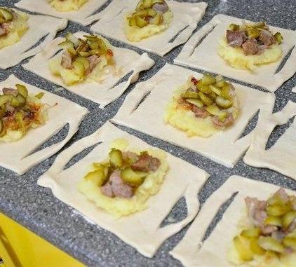 Филе свинины режем на маленькой соломкой, солим, перчим по вкусу и обжариваем на растительном масле 10 минут. Картофель отвариваем и делаем пюре с добавлем ложки сливочного масла. Выкладываем на тесто немного пюре, потом ложку мяса, сверху посыпаем мелкопорезанным луком и солёными огурцами.