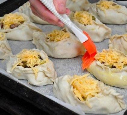 Выкладываем пироги на противень, посыпаем тертым сыром и отправляем в разогретую до 200 °C духовку на 20 минут.