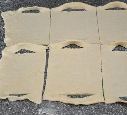 Тесто режем на прямоугольники, отступаем от края узких сторон примерно 1 см и делаем надрезы не доходя до краев 1-2 см.