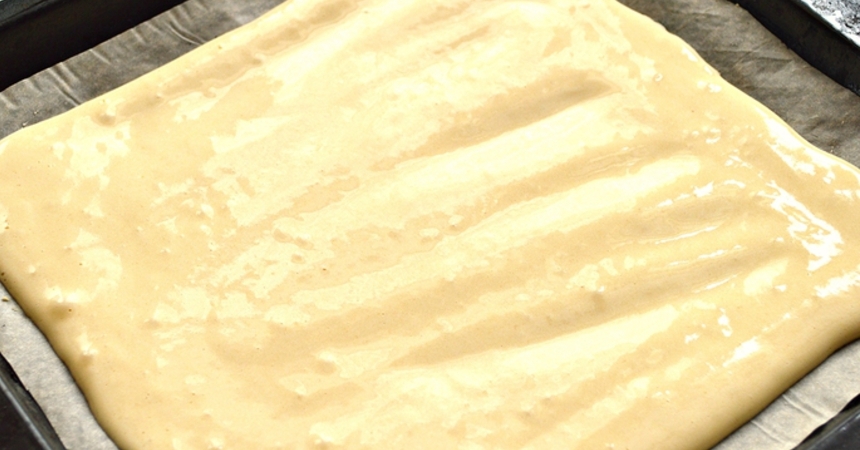 Заливаем тесто на противень, застеленный пергаментом. Равномерно распределяем по всей площади и отправляем в разогретую духовку на 20 минут.