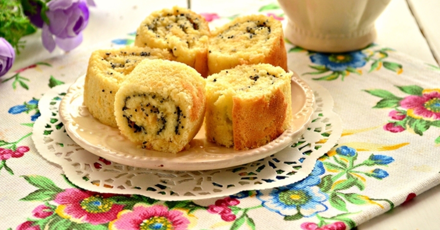 Отделяем корж от пергамента, смазываем его сгущёнкой и посыпаем маком. Сворачиваем рулет и режем на части.