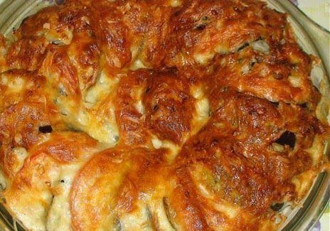 Перекручиваем куриное филе с луком и чесноком. Режем помидоры и баклажаны дольками. Баклажаны слегка поджариваем на сковородке. Фарш укладываем на дольки баклажана и выкладываем овощи в форму для запекания по кругу. Сверху кидаем небольшие кусочки сливочного масла