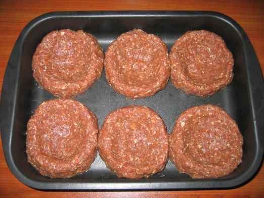 Лук и морковь измельчаем в блендере и добавляем в фарш. Солим, перчим и перемешиваем. Делим фарш на 6 частей и делаем их них гнезда, укладываем на противень.